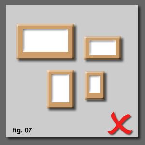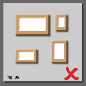 So, hanging same-sized, same-shaped pictures is easy, but what about when we start to mix it up a bit? Three simple rules apply: 1) Larger/landscape pictures always go above smaller/portrait images. 2) Align Horizontally from the top. 3) then Vertically from the middle unless there is single column, in which case align from a side logically suggested by the space being occupied. Here we have four awkward pictures to align. Do no alighn by teh outside edges as the internal spacing becomes sloppy looking [fig. 06]. Many people are initially tempted to select the second one down here as looking nicer [fig. 07]. However, the human eye prefers level horizontal lines over vertical as weÕre happier seeing a level horizon. Although the second one down looks neat, the internal cross balance is not as visually calming as the two top aligned rows from the third example below [fig. 08]. Stand farther away and look at the overall balance. |
