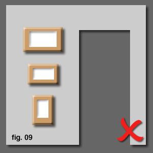 Here's an example of the background dictating usage of space. The door is as strong a visual element as the pictures and so must be considered when aligning frames. You could try and argue the casefor the middle example [fig. 10] by stating that the left-aligned arrangement is contrasting and opposing the line of the door and makes a statement. The trouble with 'making statements' is that they can visually tire quickly and look like you're over-trying to be clever. In contrast, the simple elegance of the bottom example [fig. 11] is timeless. |