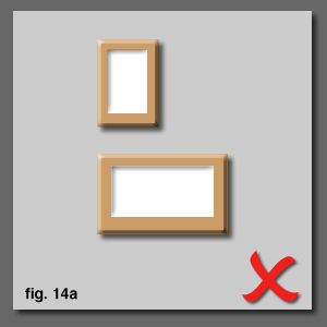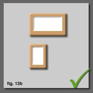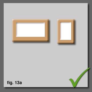 With a single landscape and a single porttait, hang side by side or [fig. 13a], if thereÕs no space for that, hang the landscape above and side align the portrait below [fig. 13b]. The portrait hangs calmly from the landscape. If we place the portrait on top, it looks dangerously unbalanced [fig. 14a], as if it could topple. Similarly, centre aligning the portrait under the landscape loos like it might visually topple [fig. 14b]. |