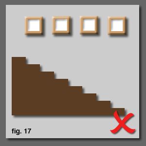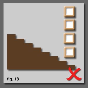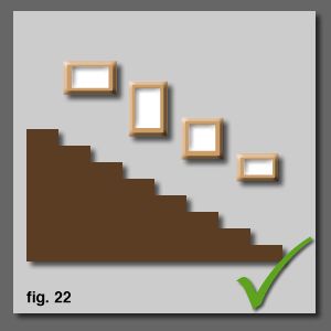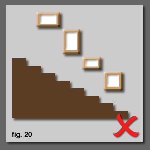 At some point, most people will attempt to hang a line of pictures up the stairs and there are various ways people do it... most of them wrong. A straight horizontal line proves tricky when hanging those high up pictures and no one can see them [fig. 17]. A vertical stack is a bit overbearing and you have to stand craning your neck up to look at them [fig. 18]. Obviously, most people realise that a diagonal line is the best balance. With square pictures, it is temptingto go corner to corner. However, this will create a 45 degree line and most stairs are a much shallower angle than this [fig. 19]. Even worse is where people matchup corner to corner with non-square pictures. You end up with a crazy design that will go randomly [fig. 20]. |