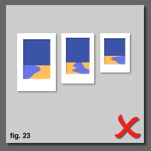 Special exceptions At home we have a triptych of John Miller beachscapes above the bed. Because they are coming away from a wall at left we balance that off with a large to small arrangement from left to right. The rules of hanging pictures would dictate that the pictures should be hung like the top diagram [fig. 23]. However, in this particular case, the actual content of the images means that this arrangement looks odd. Because of the similarity of the images and the strong horizon line, itÕs best in this case to line up the horizon and let the strong visual content set the alingment [fig. 24]. |