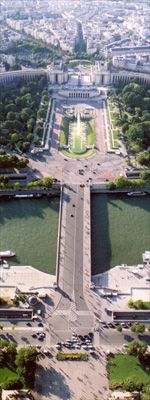 Scenes taken from the Eiffel tower. The evening sun dramatically extends the length of shadows on the ground making it easier to see the tiny figures below.