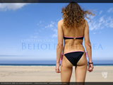 A female in a black and pink tie-side bikini stands on Hayle Beach, Cornwall and looks out to sea.
