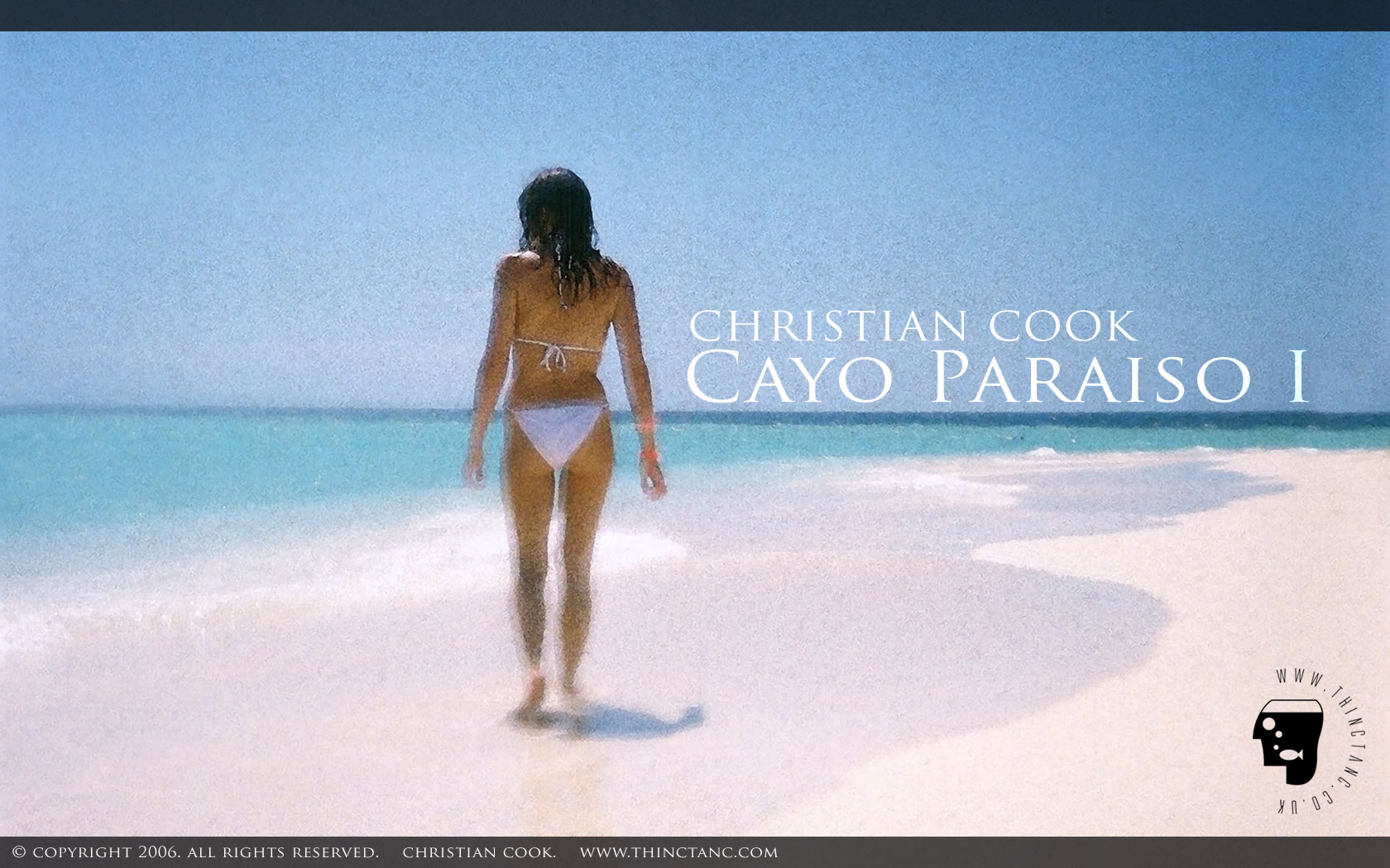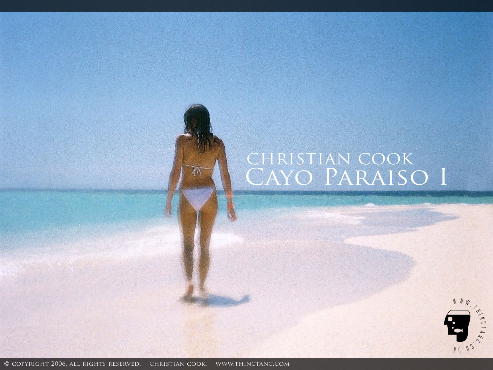 A female in a white tie-side bikini walks along golden sand with turquoise water and blue sky visible in the background. Taken in the Dominican Republic on the isolated beach sandbar of Cayo Paraiso (Paradise Island.)