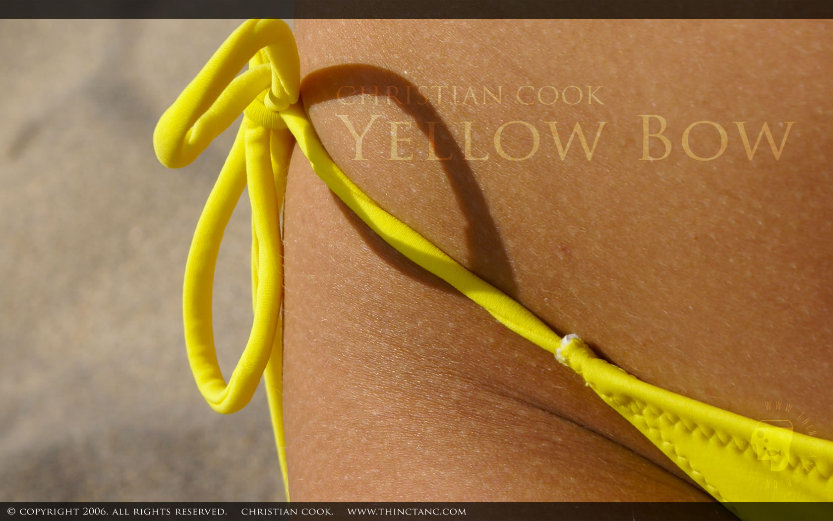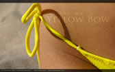 Abstract shot of a yellow bikini bow on a female's hips against sand.
