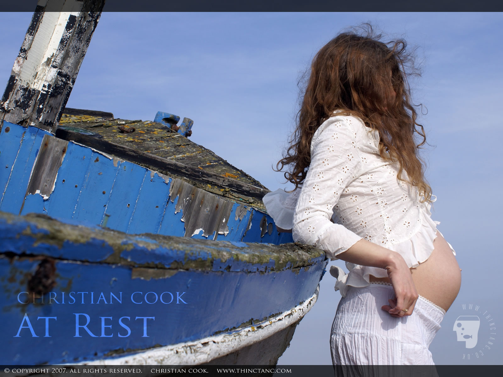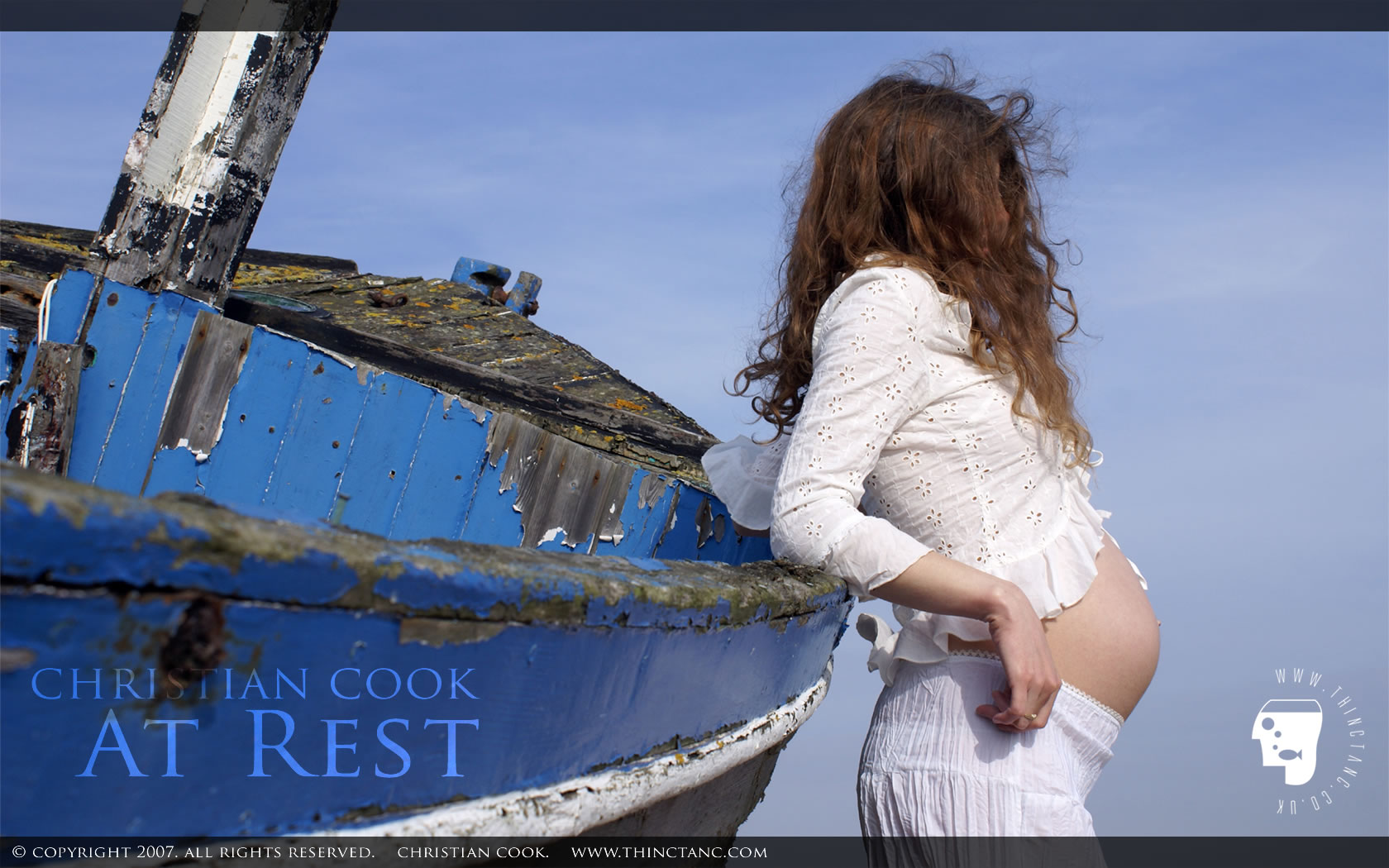 A pregnant female in white lace rests against the side of a blue fishing boat.