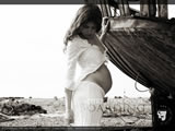 A pregnant female in white lace, looking at the debris around her feet, leaning against an old fishing boat.