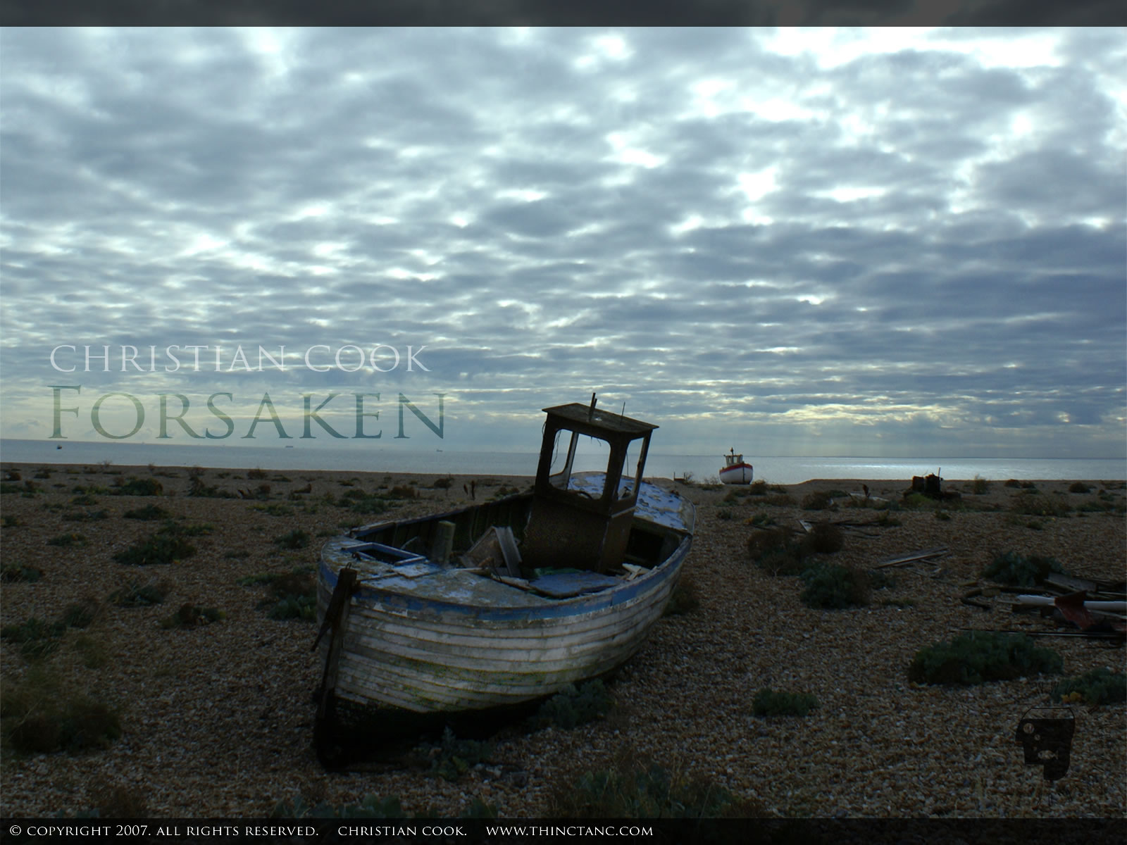 An old fishing boat sits abandoned in a bleak landscape under a brooding sky.