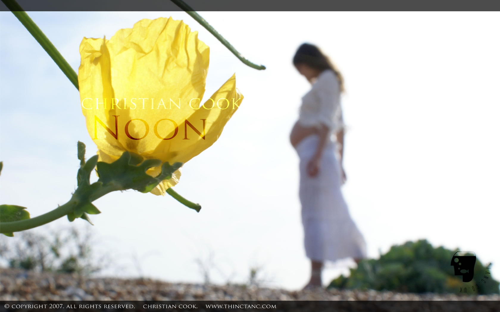 A yellow flower on a shingle spit, illuminated by the sun. In the background a pregnant female in white lace walks by