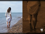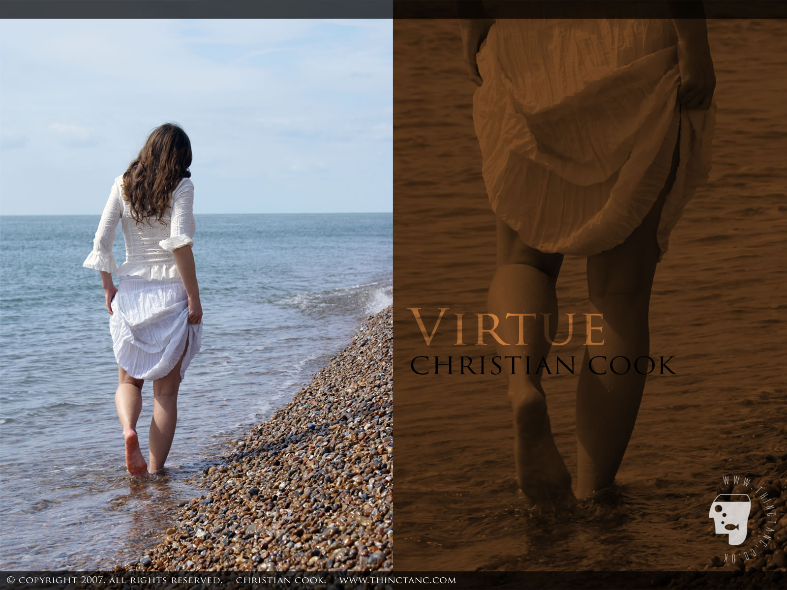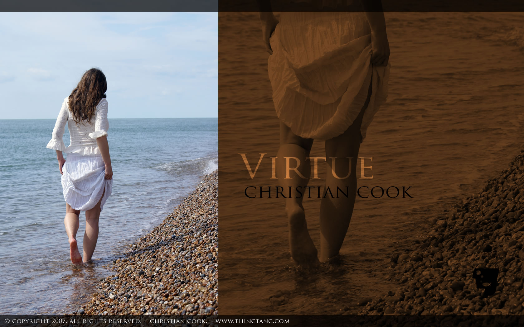 A female in white lace pulls up her skirt and paddles along the shallows on a shingle beach.