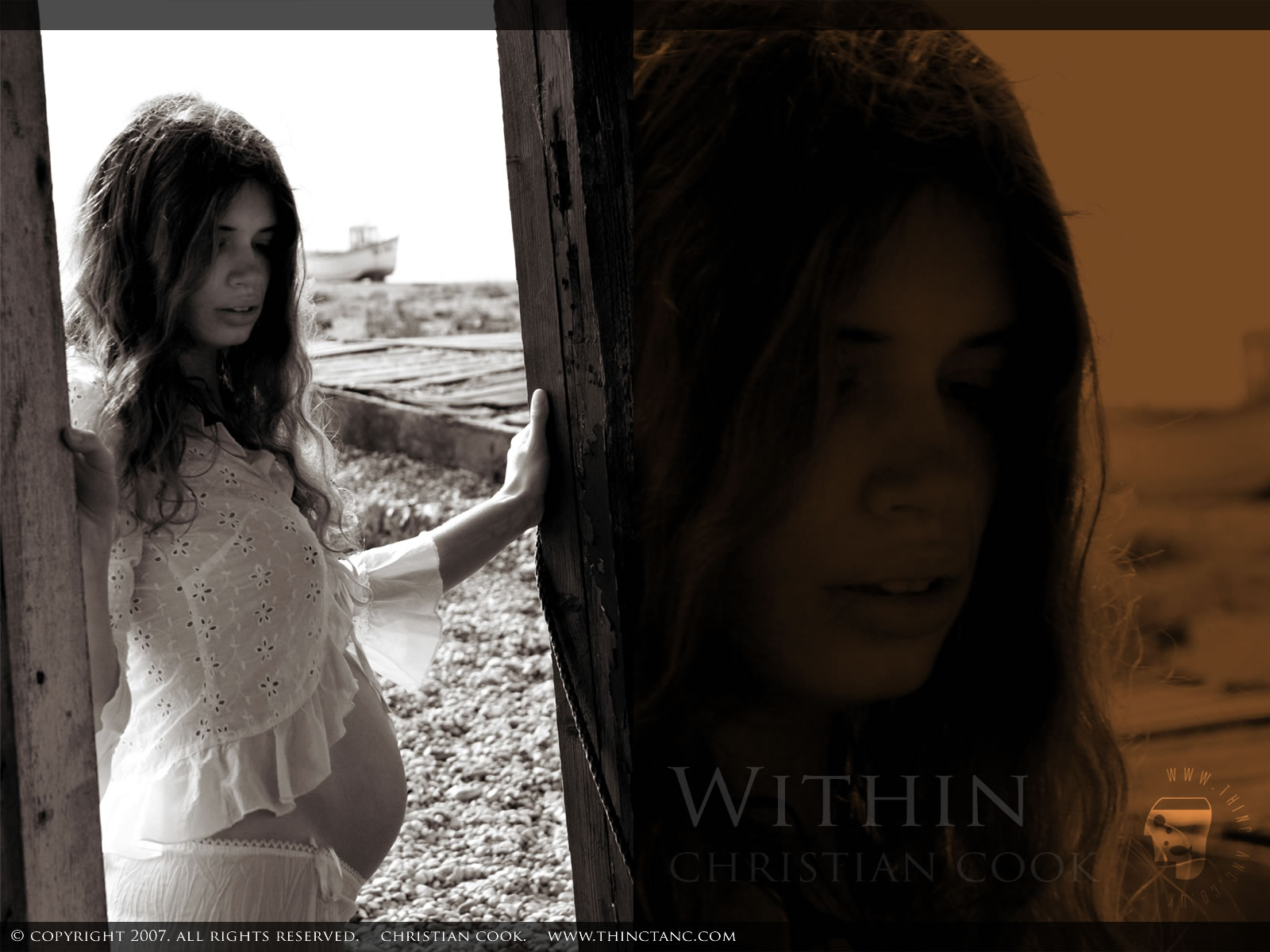 A pregnant female in white lace stands in the doorway of a wooden hut on a shingle spit with a fishing boat visible on the horizon.