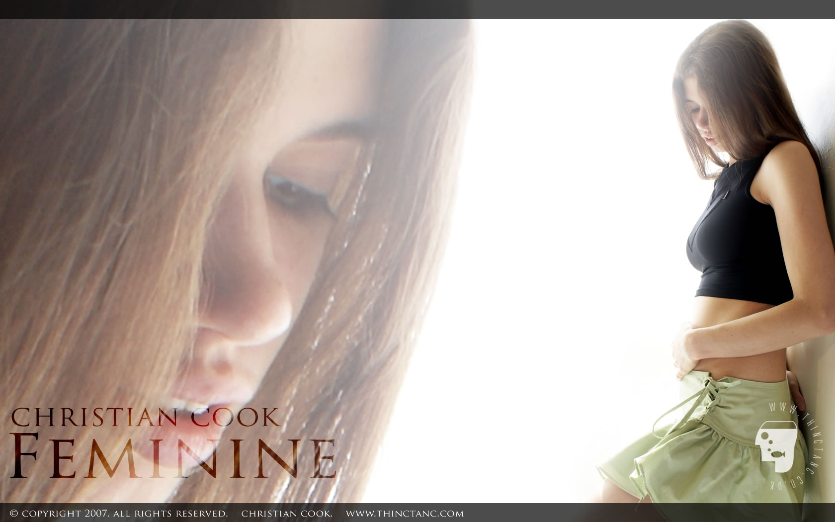 A brunette female in black crop top and green flared miniskirt leans against a wall, lit by radiant sunlight.
