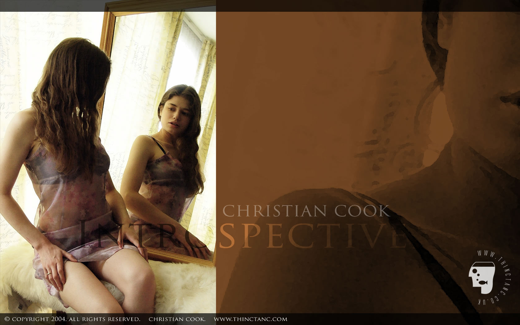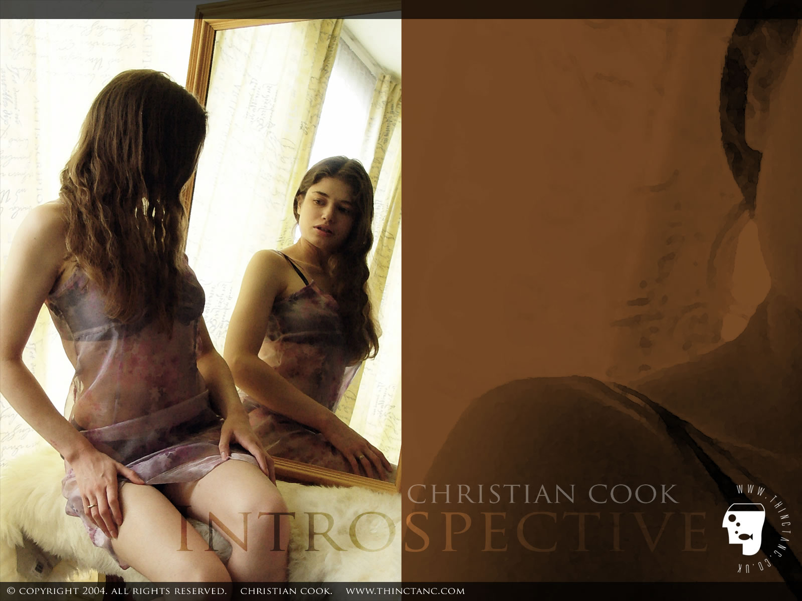 A female in a sheer pink floral slip sits looking into a mirror near a sunlit bay window.