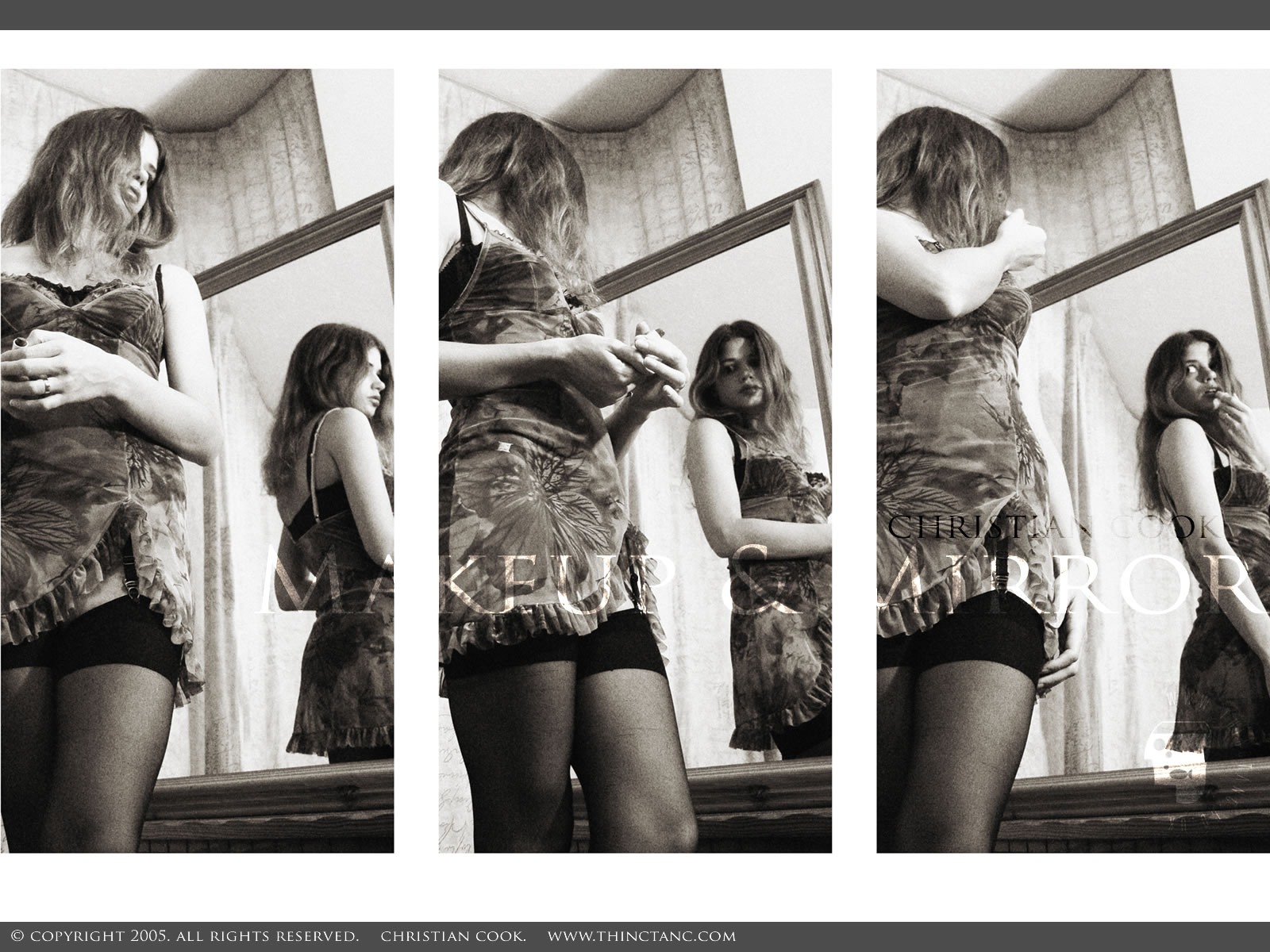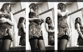 Triptych of a female in sheer floral slip and stockings applying lipstick in a mirror.