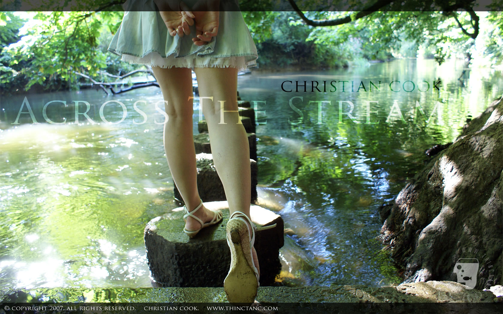A girl in short blue miniskirt and white sandals, stands contemplating a row of steppings stones across a wooded stream.