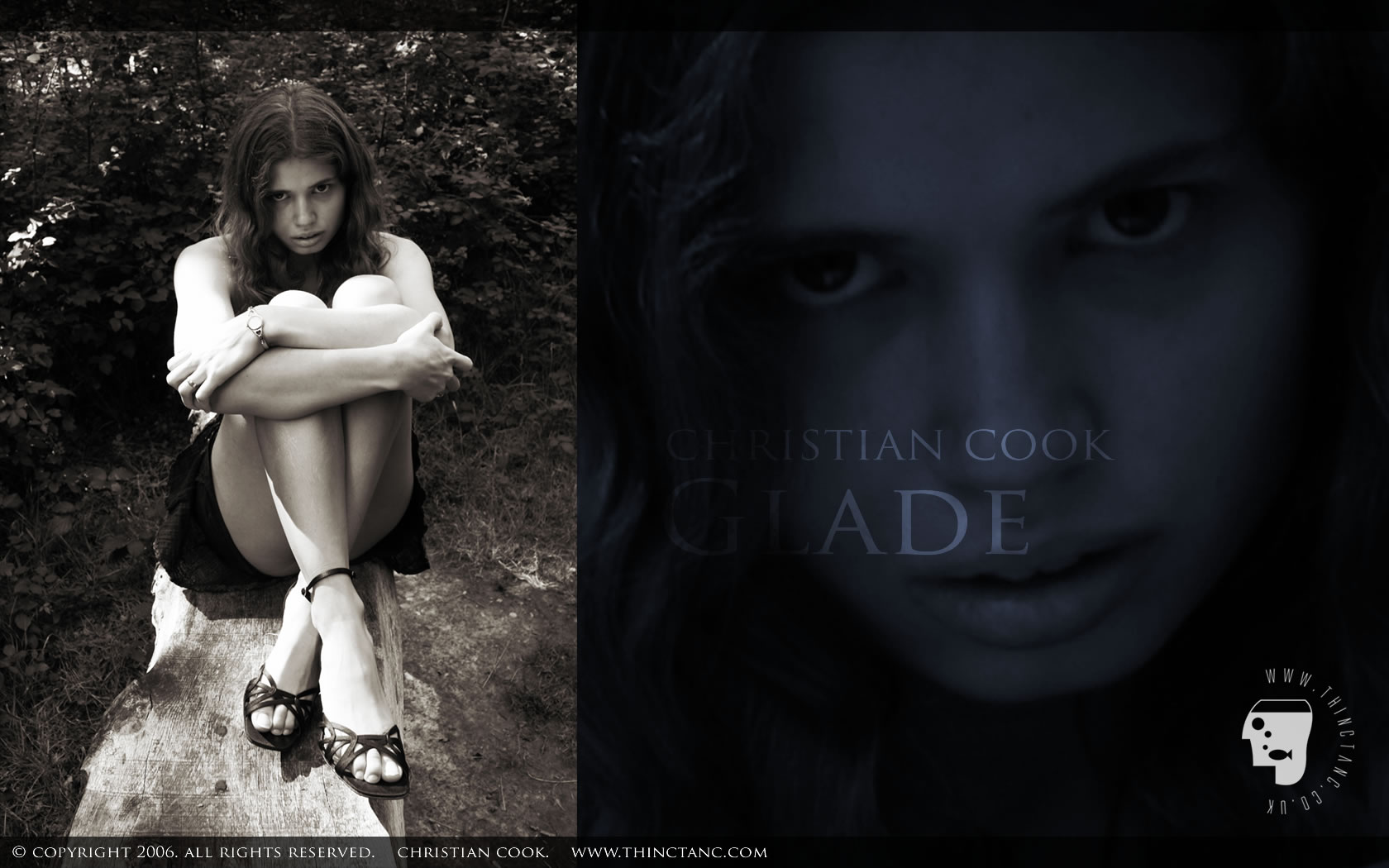 A female in short miniskirt and sandals sits cross legged on a wooden bench in a woodland glade.