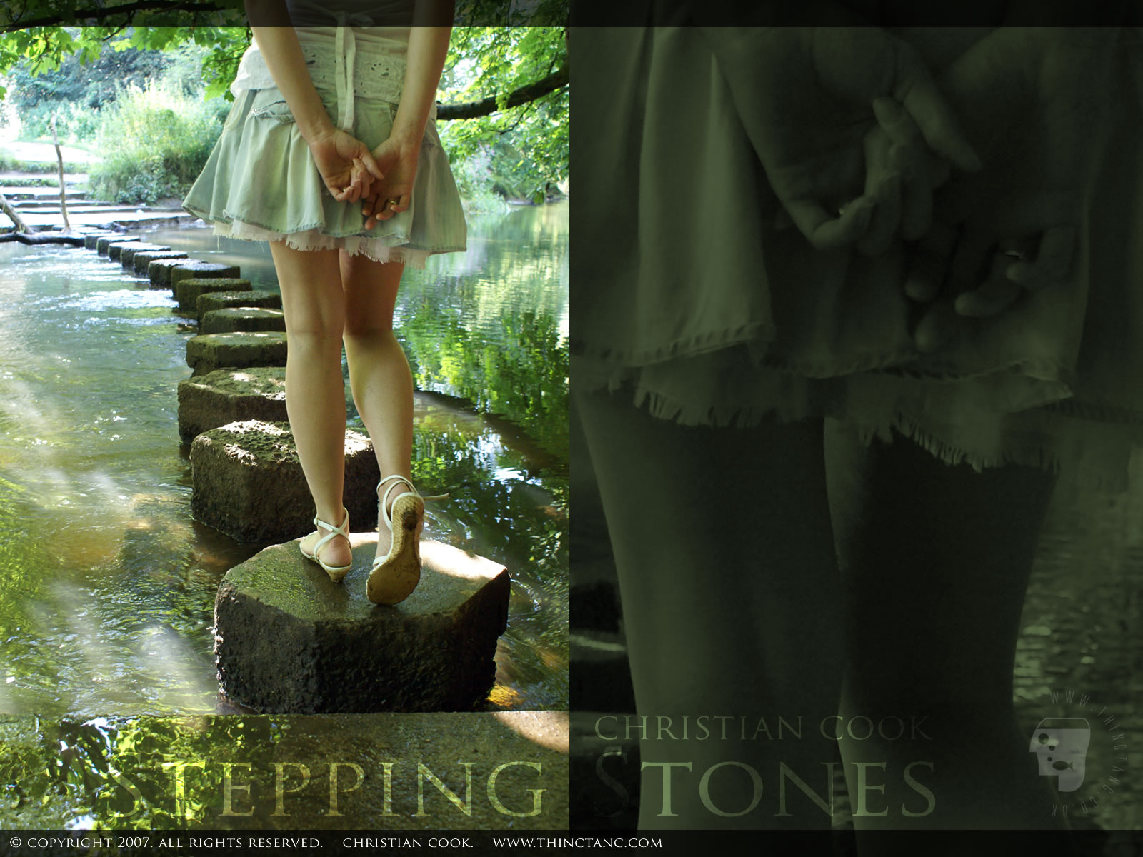 A girl in short blue miniskirt steps hesitantly onto the first stepping stone across a wooded stream.