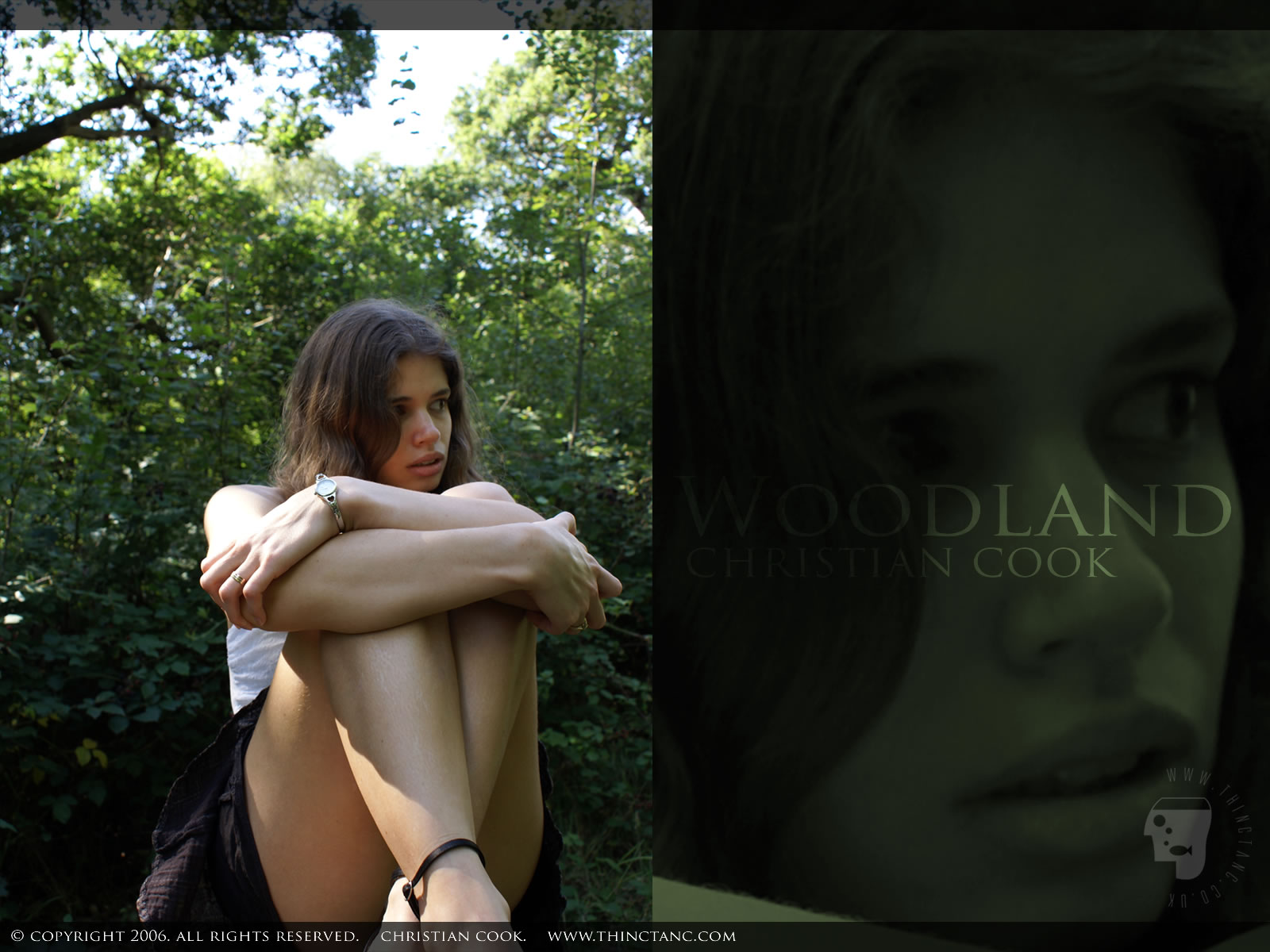 A female in short miniskirt and strappy sandals sits cross legged in a forest clearing.