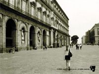 | Piazza in Naples. The edge of the building creates a line that extends down through the female, provinding a focal point to balance up the dark archways to the left. | ||