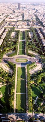 Scenes taken from the Eiffel tower. The evening sun dramatically extends the length of shadows on the ground making it easier to see the tiny figures below.