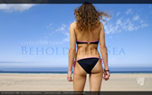 A female in a black and pink tie-side bikini stands on Hayle Beach, Cornwall and looks out to sea.