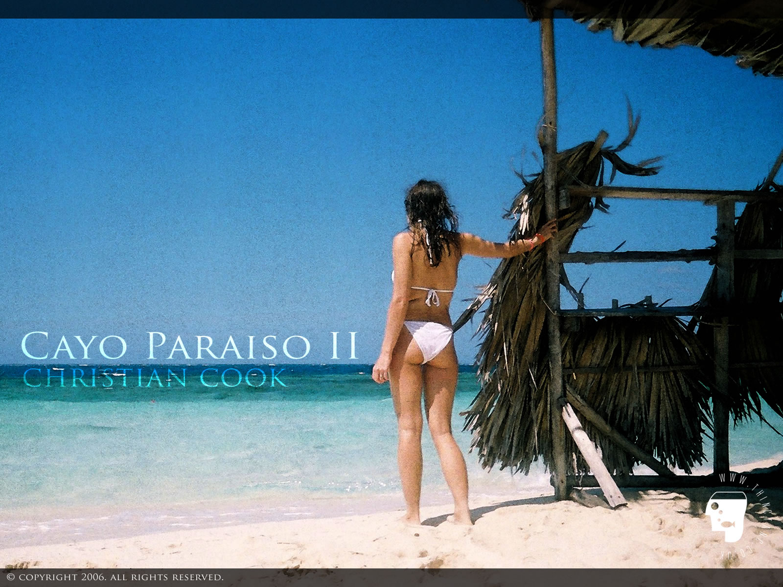 A woman in a white tie-side bikini stands holding the edge of a plam shelter, looking out to sea. Taken in the Dominican Republic on the isolated beach sandbar of Cayo Paraiso (Paradise Island.)