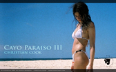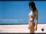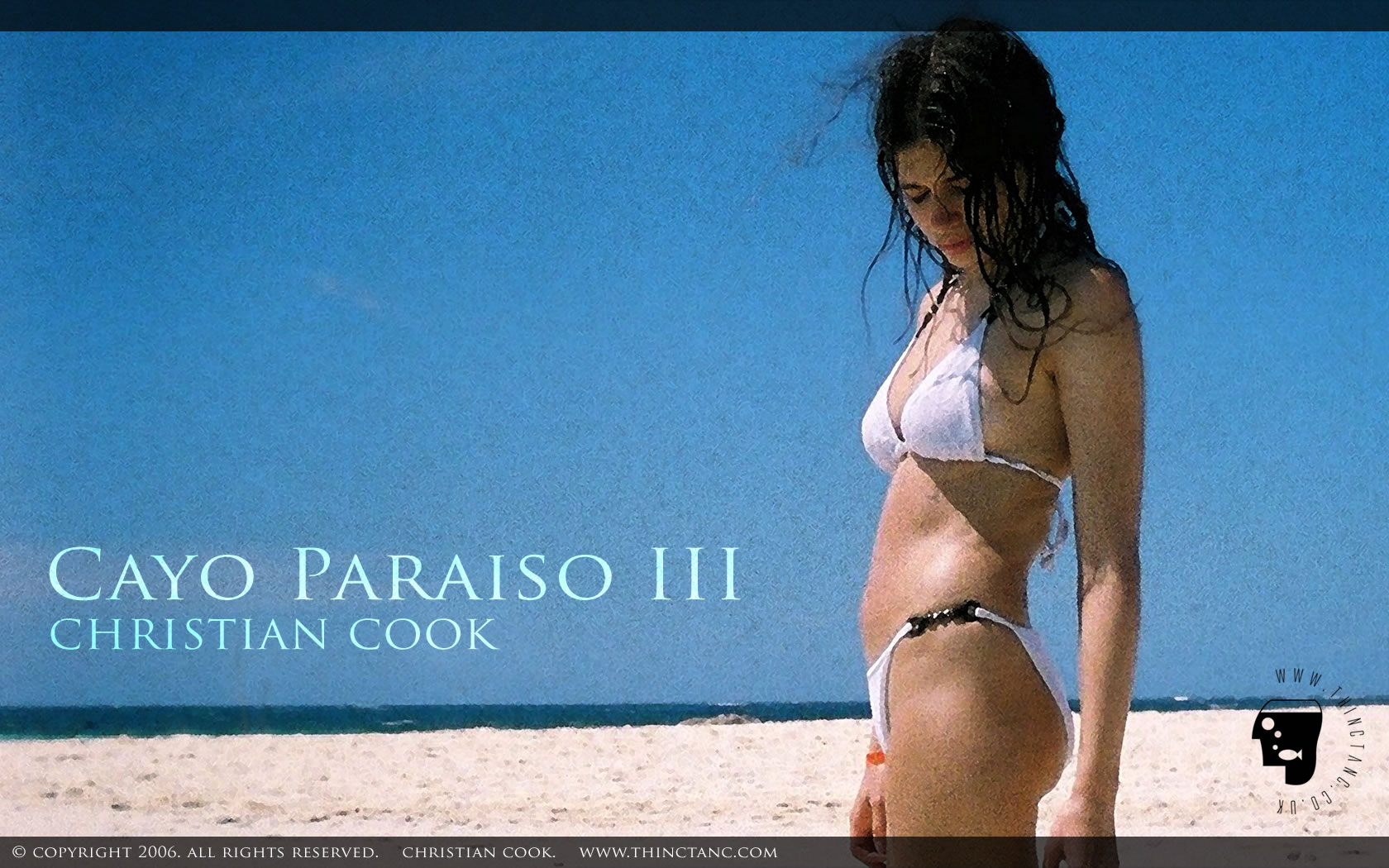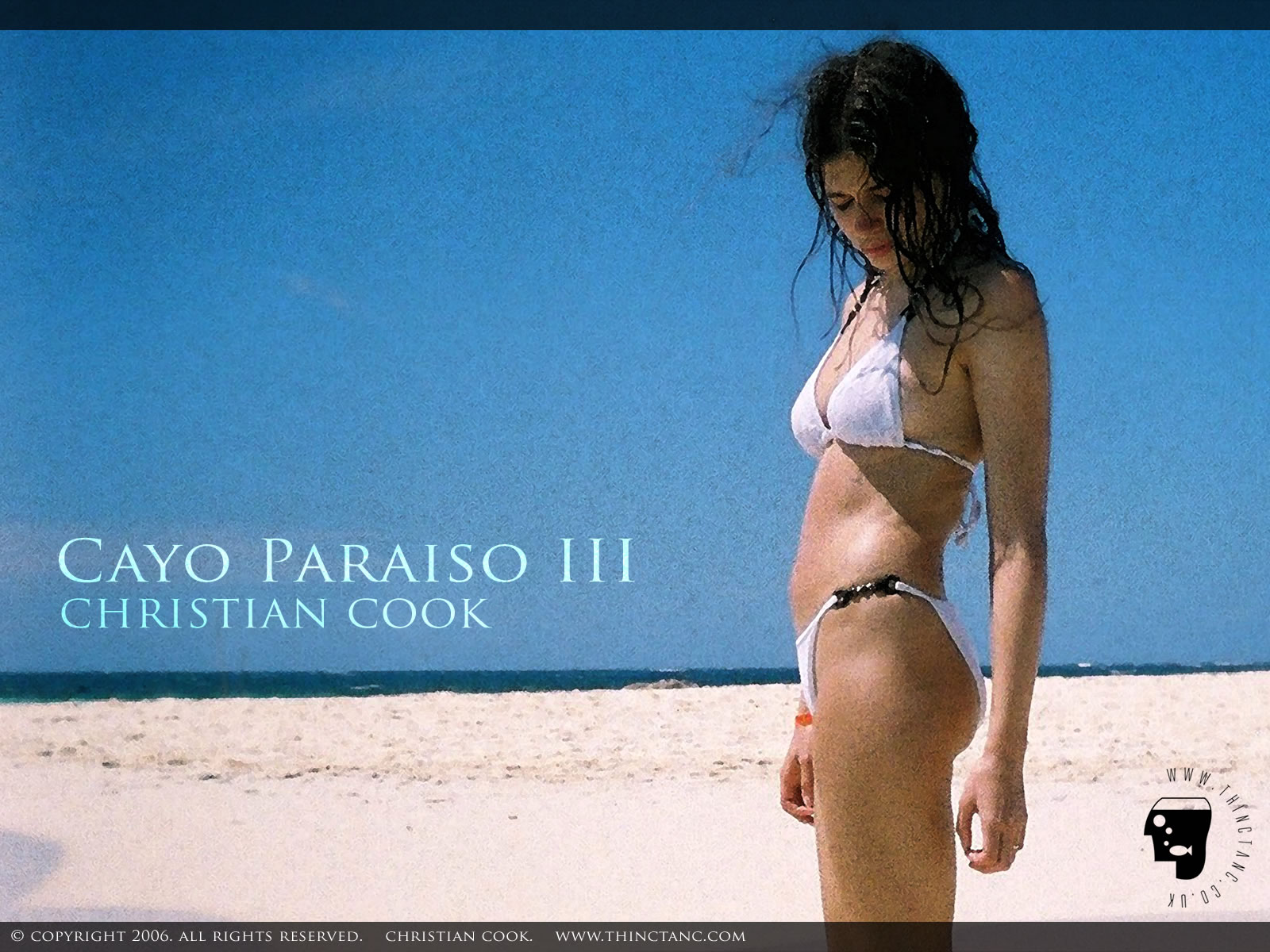 A girl in a white tie-side bikini stands on golden sand watching the water lap around her feet. A clear blue sky is visible in the background. Taken in the Dominican Republic on the isolated beach sandbar of Cayo Paraiso (Paradise Island.)
