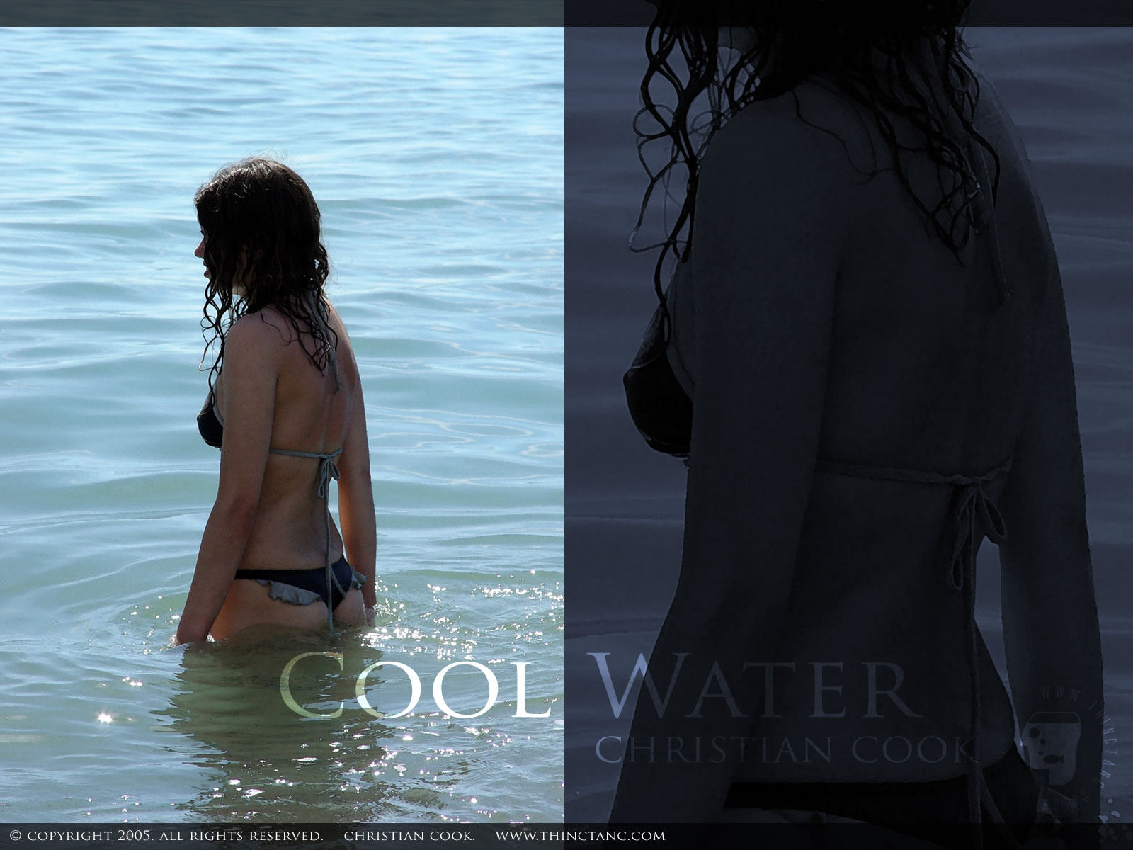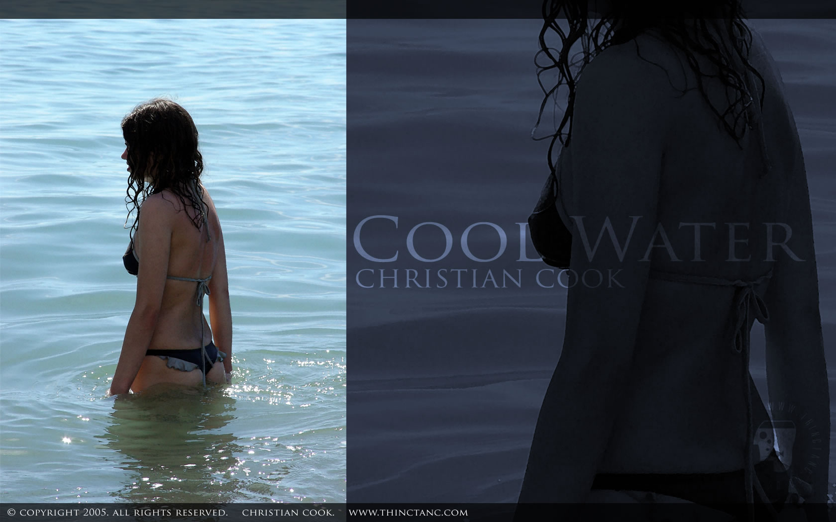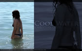 A woman in a black ruffled bikini stands in water up to her hips while the sun sparkles off the swirling turquoise water around her.