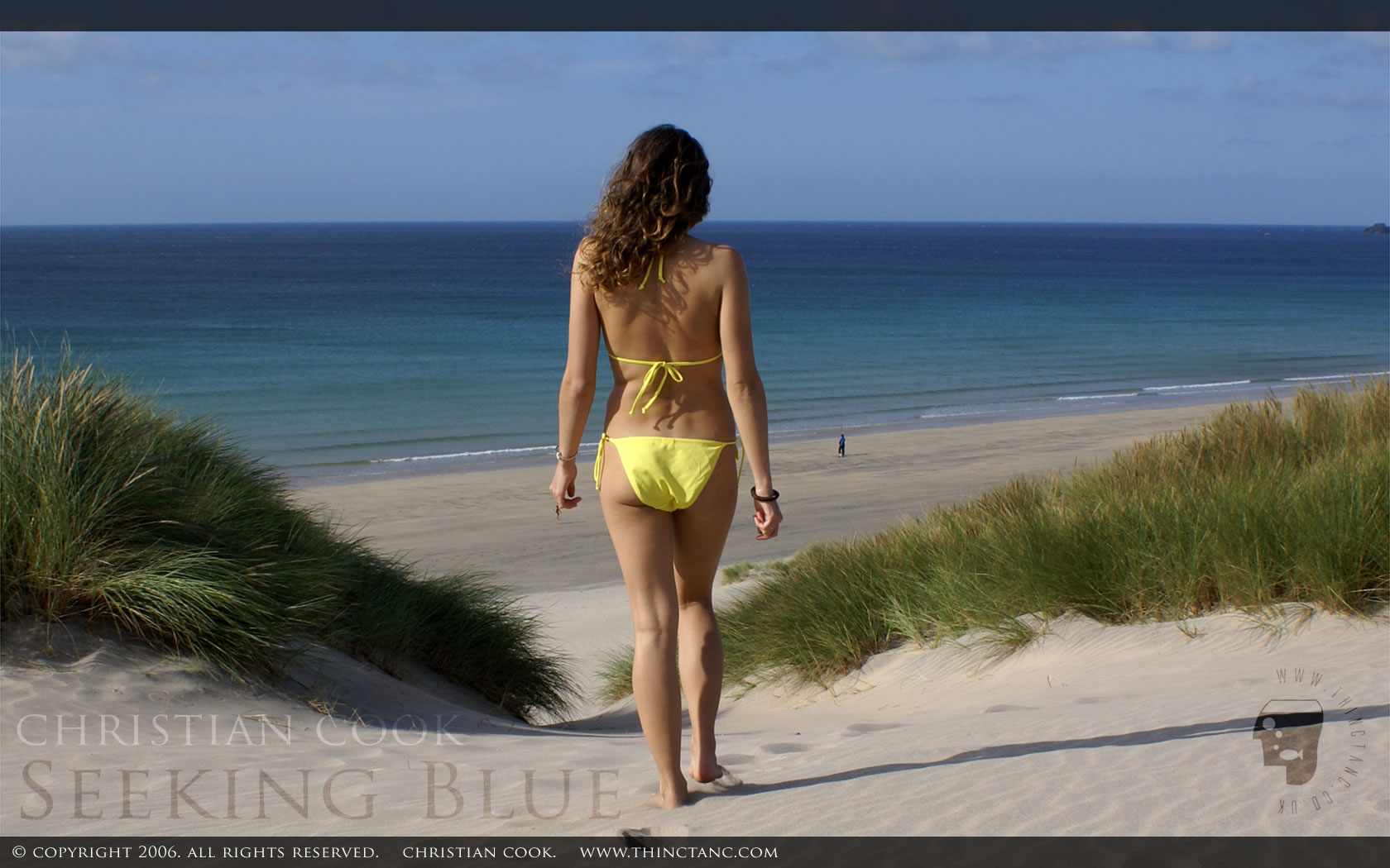 A petite brunette female in a yellow bikini walking down through dunes to the beach and sea beyond.
