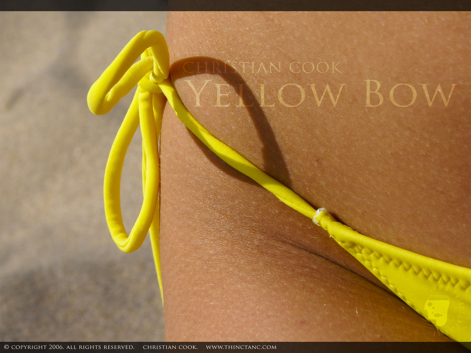 Abstract shot of a yellow bikini bow on a female's hips against sand.