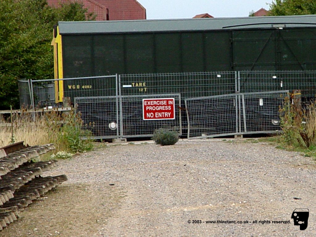 A train and a fence make it clear that visitors are not welcome to drive through (Not even slowly).