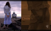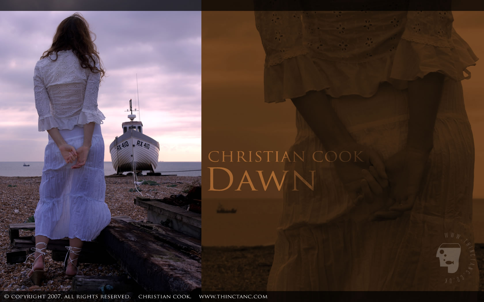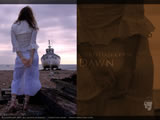 A female in white lace, standing looking at a fishing boat on the shore, against a pink dawn.