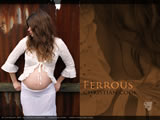 A pregnant female in white lace stands against the rusting corrugated iron wall of an old shack.