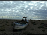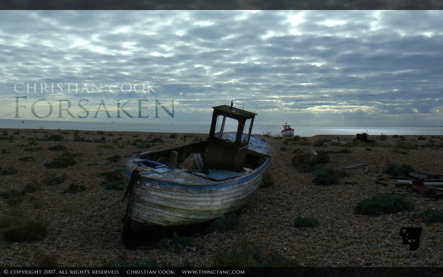 An old fishing boat sits abandoned in a bleak landscape under a brooding sky.