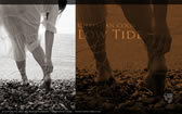 A female in white lace bends over to untie her strappy sandals on a shingle shoreline.