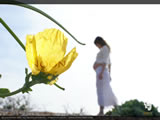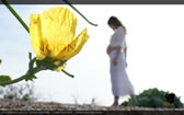 A yellow flower on a shingle spit, illuminated by the sun. In the background a pregnant female in white lace walks by