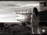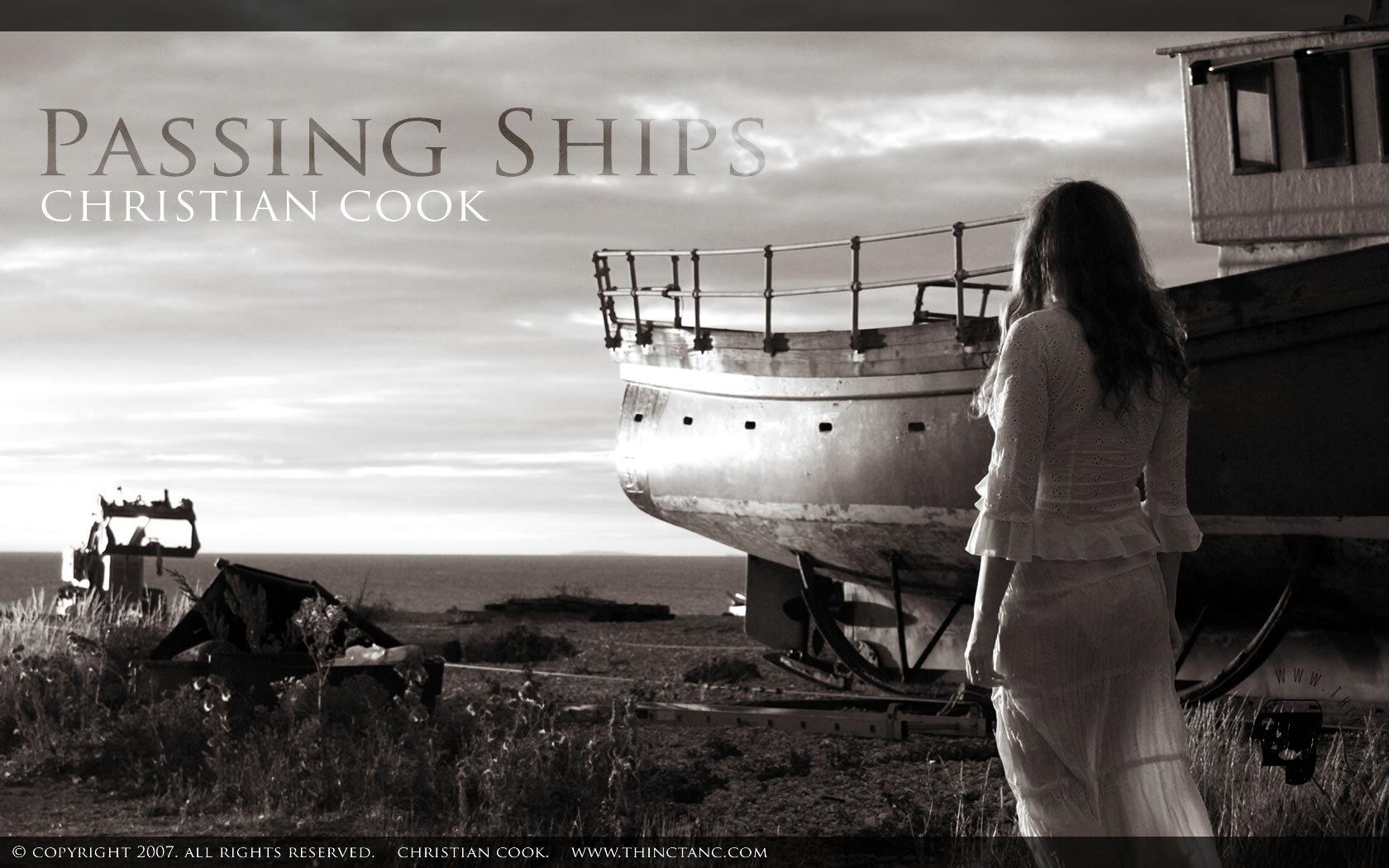 A female in white lace walks past a fishing boat resting on the shore at dawn. The sea is visible beyond an earth mover sitting on the shore.