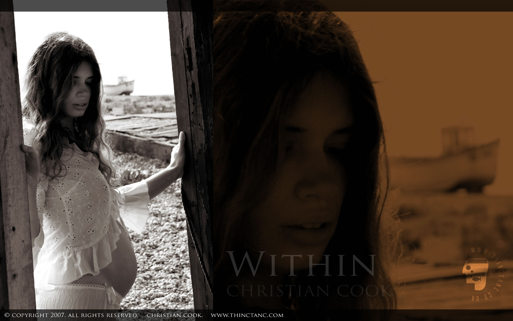 A pregnant female in white lace stands in the doorway of a wooden hut on a shingle spit with a fishing boat visible on the horizon.