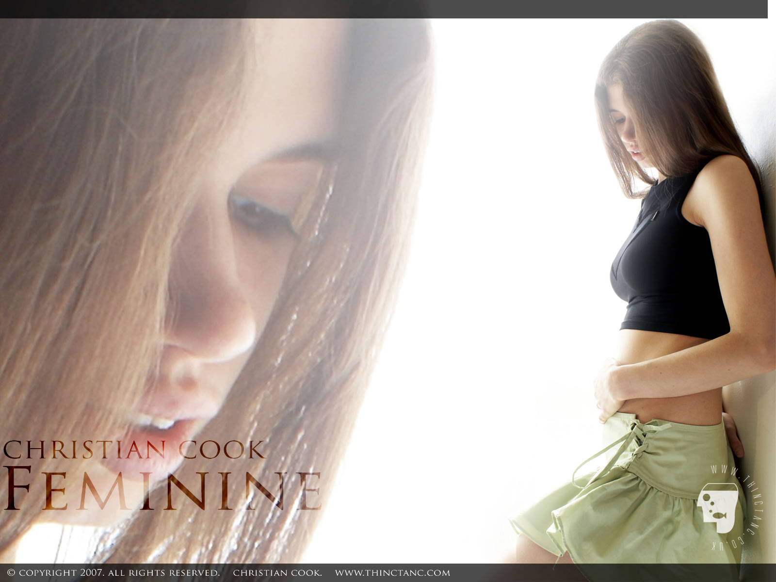 A brunette female in black crop top and green flared miniskirt leans against a wall, lit by radiant sunlight.