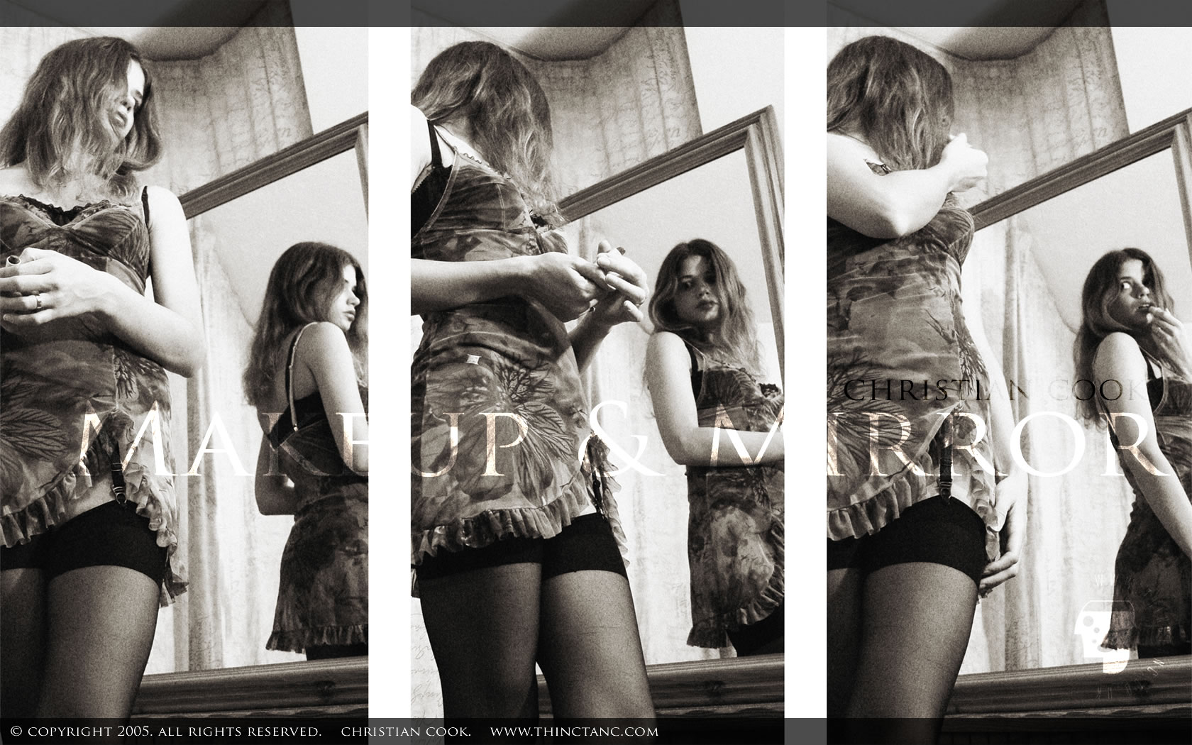 Triptych of a female in sheer floral slip and stockings applying lipstick in a mirror.