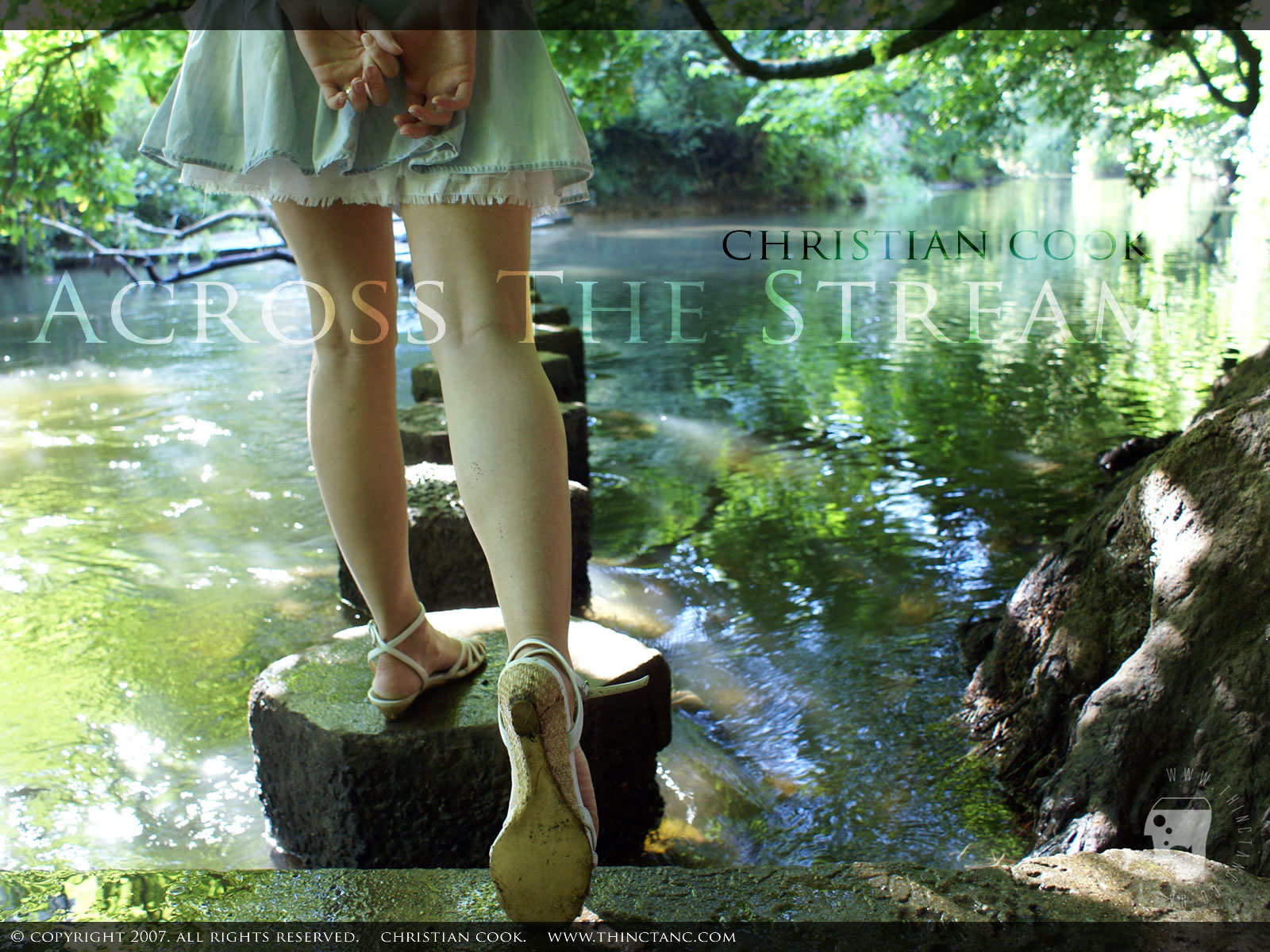 A girl in short blue miniskirt and white sandals, stands contemplating a row of steppings stones across a wooded stream.