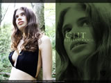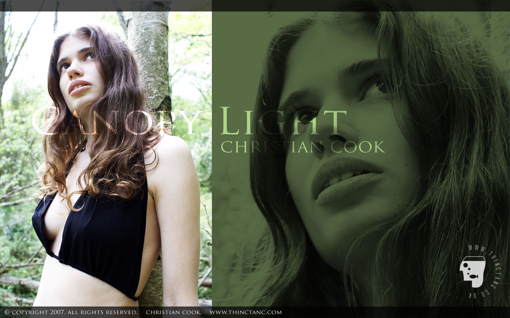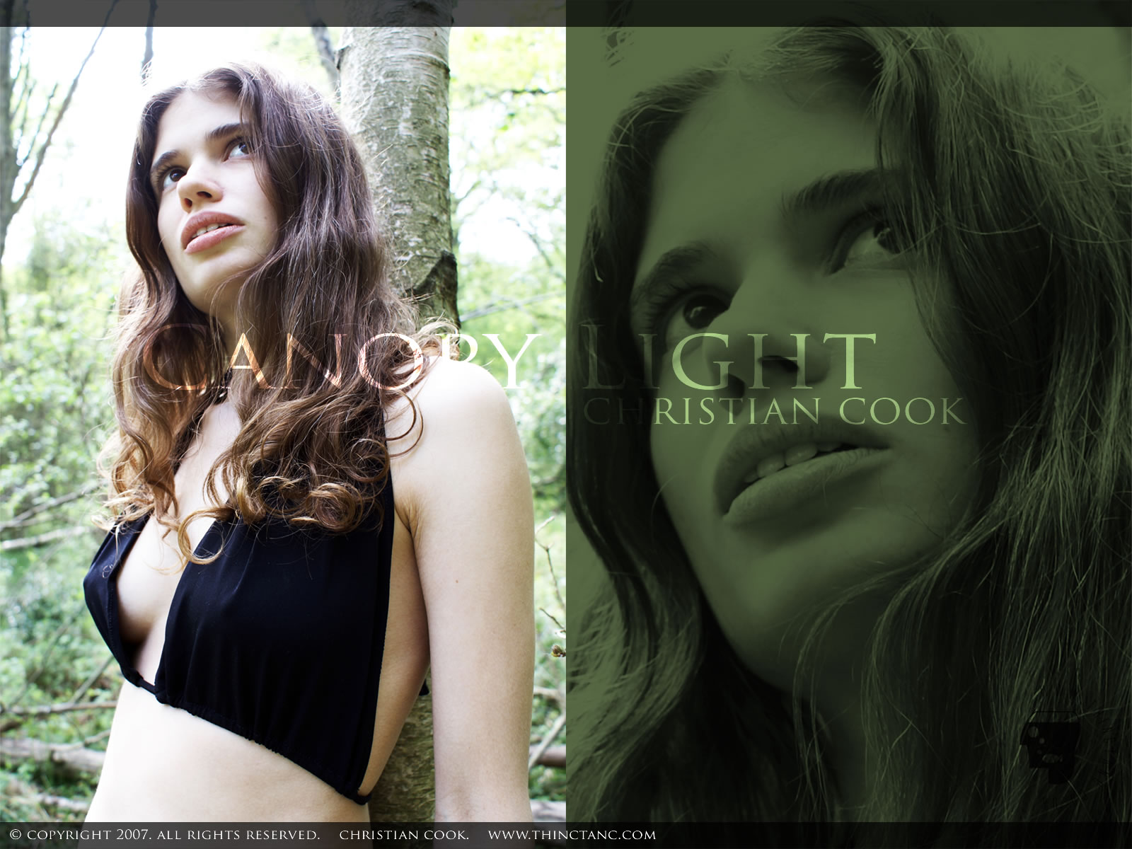 A brunette female in black wrap crop top leans against a tree and stares up into the radiant sunlit canopy.