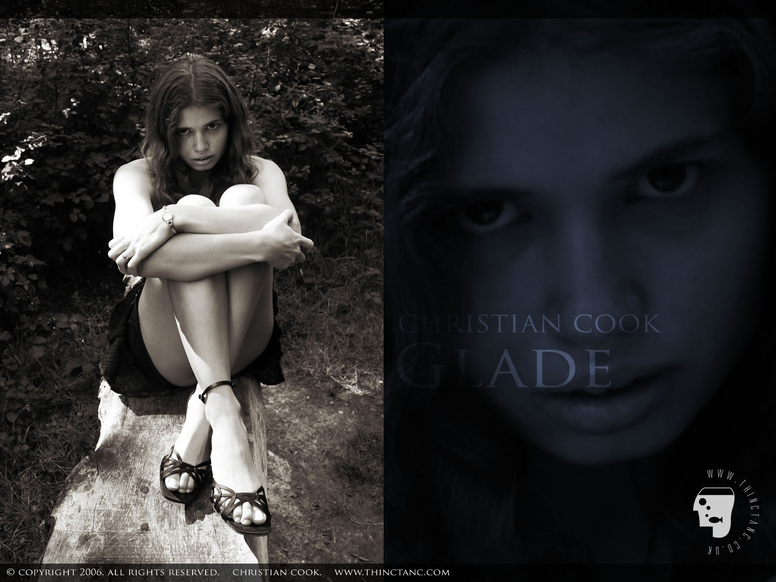 A female in short miniskirt and sandals sits cross legged on a wooden bench in a woodland glade.