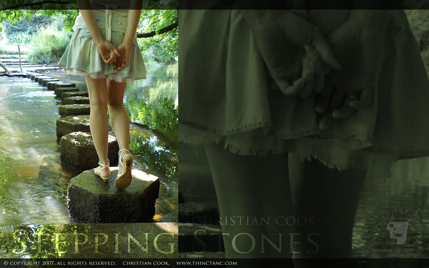 A girl in short blue miniskirt steps hesitantly onto the first stepping stone across a wooded stream.